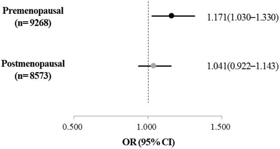 Adjusted OR for the risk for being obese and the interaction between menopausal status and sleep duration were examined using a multivariate logistic regression model after adjustment for age, education level, monthly household income, hypertension, cardiovascular disease, diabetes, smoking status, alcohol drinking, and physical activity (Figure 3). A significant interaction between menopausal status and sleep duration was found to be associated with the risk for being obese (p-interaction = 0.002). However, among postmenopausal women, no significant association was observed between obesity and sleep duration (p = 0.632). On the other hand, only among premenopausal women with short sleep duration, the adjusted OR for the risk for being obese significantly increased (p = 0.016). After adjusting for covariates, premenopausal women with short sleep duration showed a significantly increased risk for being obese (1.171 times) compared with women with adequate sleep duration (95% CI = 1.030–1.330).