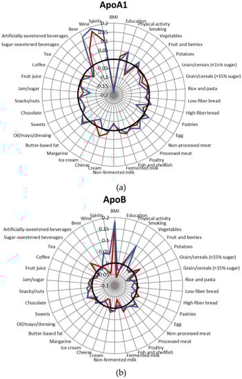 Cardiovascular diseases (CVD) comprise a group of diseases targeting the circulatory system and are considered the most frequent cause of death in the Western world [1]. One of the main causes of CVD is atherosclerotic plaque accumulation in blood vessels, which results in ischemia, inflammation and thrombi, phenomena that can lead to hypoxia-inducing occlusions [2]. Cholesterol participates in the development of atherosclerosis and is thus an important risk factor for CVD [3]. Lipoproteins are the primary transporters of lipids (i.e., cholesterol and free fatty acids) in the body, and the following five different types of lipoproteins are present in the system: very low-, low-, intermediate- and high-density lipoproteins (VLDL, LDL, IDL, HDL, respectively) and chylomicrons. High LDL concentrations, low HDL concentrations, and in particular, a low HDL/LDL ratio, are established markers of the risk of CVD, especially coronary artery disease. The surface of the lipoprotein is equipped with apolipoproteins (Apo), which both guide lipid transportation and interact with specific receptors to facilitate the uptake and deposition of lipids into tissue; thus, they play a central role in cholesterol metabolism [4,5]. ApoA1 represents the major HDL Apo and is the main acceptor of cholesterol when HDL transports cholesterol from the tissues to the liver to be excreted from the body. ApoB, a common denominator for the two forms of ApoB, i.e., ApoB48, the truncated form of ApoB; and ApoB100, the full form of Apo, is the major Apo of VLDL, IDL, LDL and lipoprotein (a). These molecules transport triacylglycerol (TG) and cholesterol from the liver to cells. Therefore, ApoB concentrations are a measure of the total numbers of all atherogenic particles, including VLDL, IDL and LDL, while ApoA1 is a measure of HDL particles. The results of several epidemiologic studies and clinical trials indicate that high ApoB concentrations, low ApoA1 concentrations and the ApoB/ApoA1 ratio may be better markers of the risk of CVD than LDL, HDL and the LDL/HDL ratio [6,7,8,9]. Several lifestyle and dietary factors play important roles in CVD prevention [10]. The associations between these factors and Apo serum concentrations have been examined in epidemiological studies [11,12,13]. However, there remains a lack of larger studies investigating these factors simultaneously. In particular, there is a lack of studies investigating multiple dietary factors. Thus, this study aimed to examine whether lifestyle and dietary factors (both macronutrients and groups of foods and beverages) are associated with serum Apo parameters (ApoA1 and ApoB concentrations and the ApoB/ApoA1 ratio) in a large population-based cohort of nearly 25,000 individuals. To our knowledge, the association between dietary factors and Apo concentrations has not yet been investigated in a cohort of this size.
