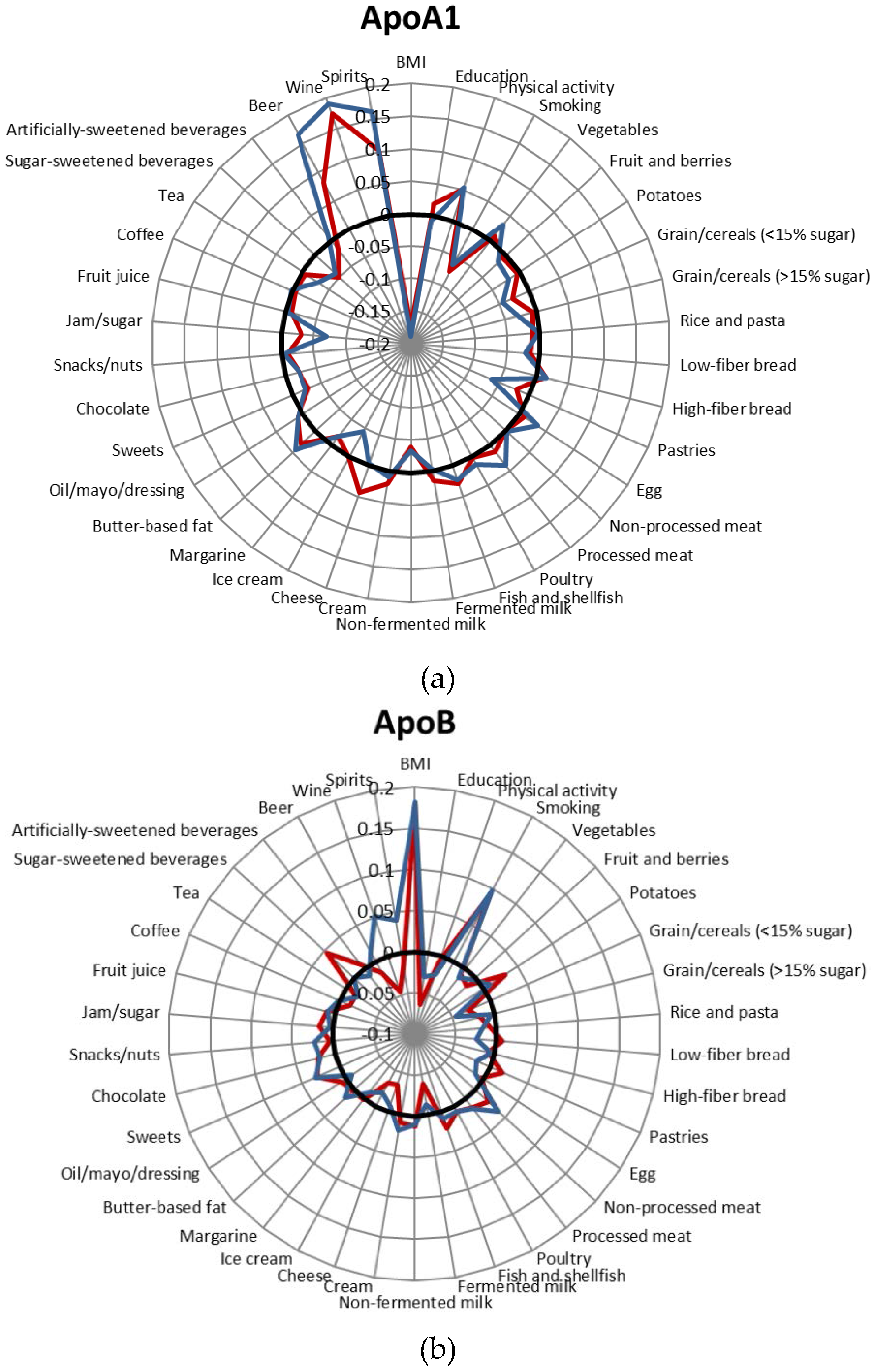 We also examined the correlations between lifestyle and dietary factors and HDL-C concentrations, LDL-C concentrations and the LDL-C/HDL-C ratio in the subsample (n = 4653) of individuals with measurements of those markers (Table S4). The combination of the lifestyle and food variables explained more of the variance in HDL-C concentrations (men: 17.7%; women: 15.1%) than in ApoA1 concentration, less of the variances in LDL-C concentrations (men: 3.5%; women 6.2%) than in ApoB concentrations, and similar percentages of the variances in the LDL-C/HDL-C ratio (men: 9.7%; women: 13.4%) than in the ApoB/ApoA1 ratio.