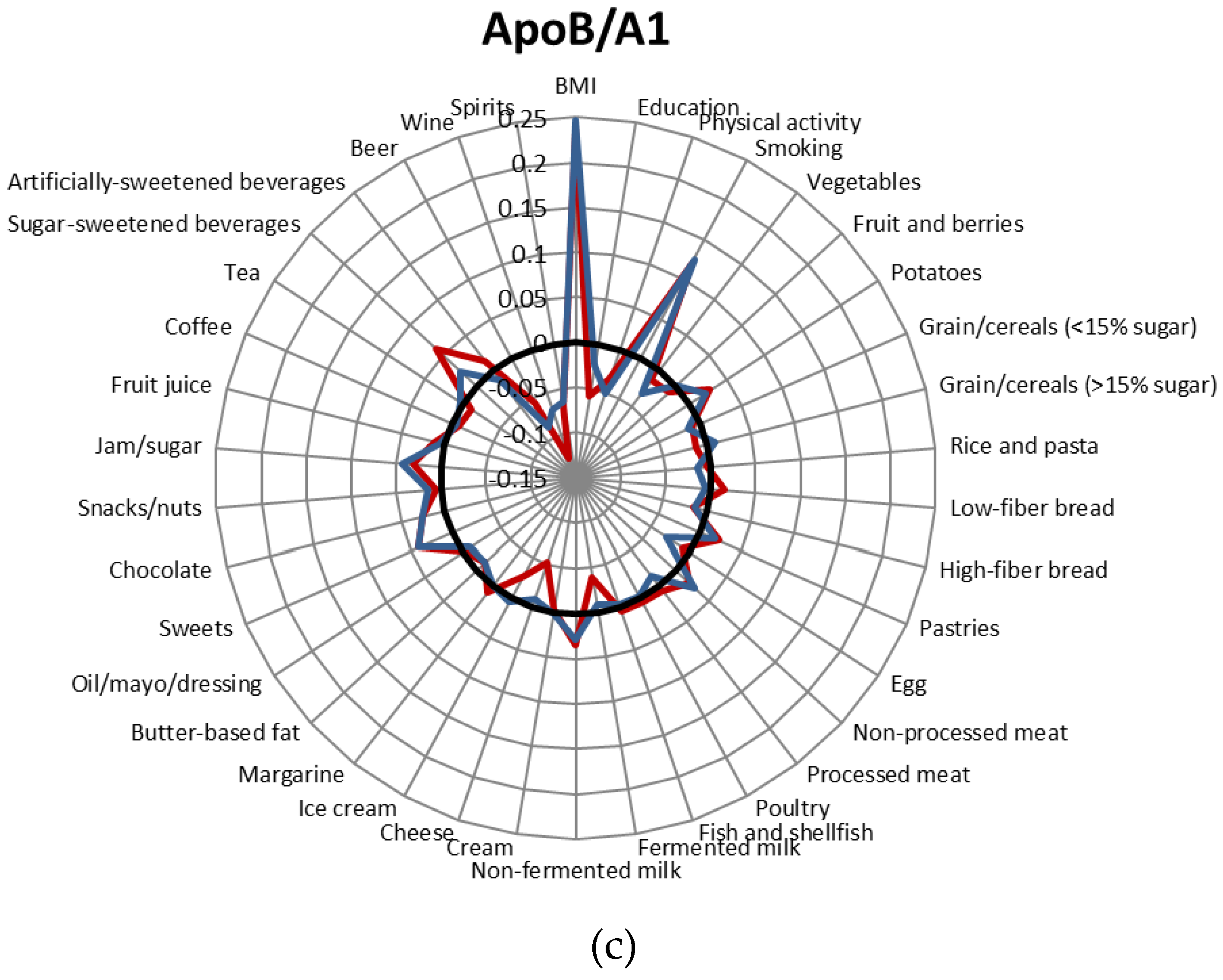 Correlations between lifestyle factors and food intake and ApoA1 concentrations (a), ApoB concentrations (b) and the ApoB/ApoA1 ratio (c). Blue: men; red: women; black: r = 0. Adjusted for age, screening date, total energy intake, BMI, leisure-time physical activity, alcohol and smoking habits. The analyses including beer, wine and spirits were not adjusted for alcohol.