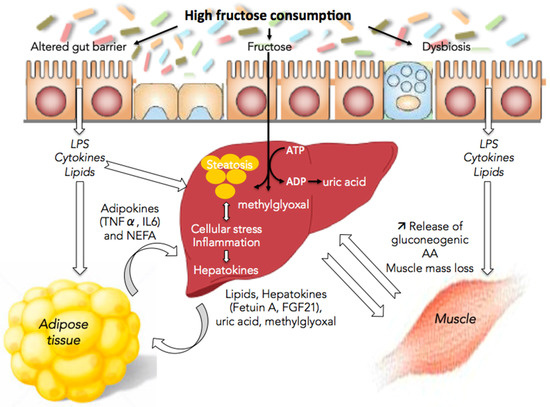 Nonalcoholic-fatty liver disease (NAFLD) represents a spectrum of disorders ranging from simple steatosis to nonalcoholic steatohepatitis (NASH), which can progress to fibrosis, cirrhosis, and liver cancer [1]. Its prevalence increases with that of type 2 diabetes, obesity, and metabolic syndrome [2] and is considered to be on average 20%–25%. Although several factors may contribute to NAFLD [3], fructose consumption is considered as a key player in the development of this disease [4,5], and it has repeatedly been reported to induce NAFLD in humans [6,7] and rodents [8,9]. A significant consumption of fructose leads to hepatic lipid accumulation and steatosis, steatosis being considered pathological when an abnormal accumulation of lipid droplets is observed in the cytoplasm of at least 5% of hepatocytes [4]. At this point, hepatic steatosis (HS) may be reversed through nutritional and physical exercise approaches [10,11]. Adversely, chronic consumption of fructose promotes several processes such as inflammation and cellular stress, which is responsible for the irreversibility of hepatic disorders and the progression of the disease [4]. The current review also provides new insights into the metabolic consequences of high fructose intake on peripheral tissues contributing to NAFLD progression.