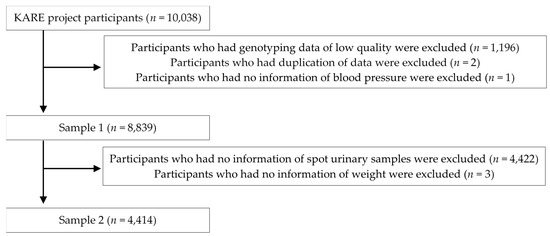 Sample 2: After excluding participants from sample 1 who had no information for spot urinary samples (n = 4422) and weight (n = 3), sample 2 included 4414 participants. Sample 2 was analyzed to clarify the association between urinary factors and blood pressure or hypertension, and to investigate interaction effects between urinary factors and tagging SNPs on the risk of hypertension.