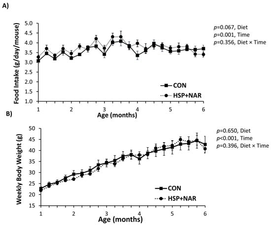 After weaning, an effect of time was observed for the mean daily food intake (p < 0.01) (Figure 1A) and weekly body weight (p < 0.001) (Figure 1B), which was expected because the mice were growing. There was no diet or time x diet effect on daily food intake or body weight throughout the study (p > 0.05). At the end of the study, the final body weights in 6-month-old offspring did not differ between CON and HSP + NAR groups. Thus, the food intake or growth characteristics of female offspring from weaning until six months of age were not affected by maternal and suckling exposure to HSP + NAR.
