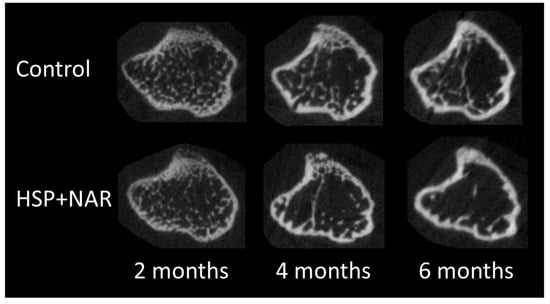With regards to the cortical bone structure at the proximal tibia, Ct.Ar was significantly lower (p < 0.05) in the HSP + NAR group compared to the CON group at 4 months of age (Table 1, Figure 2). In addition, a time x diet effect was observed (p < 0.05) for Ps.Pm at the proximal tibia, whereby HSP + NAR resulted in lower Ps.Pm at 2 months of age compared to CON (p < 0.05). However, this effect was not apparent at 4 and 6 months of age. No effects (p > 0.05) from HSP + NAR exposure on cortical TMD were observed. Thus, maternal exposure during pregnancy and lactation to a combined 0.5% HSP and 0.25% NAR diet delays some characteristics of cortical bone development in female CD-1 offspring. In addition to an effect of diet on cortical bone structure, an effect of time (p < 0.001) was observed, whereby augments to the cortical bone TMD and structure, including Ct.Ar, Ct.Ar/Tt.Ar, and Ct.Th, were observed from 2 to 6 months of age in the CON and HSP + NAR groups (Table 1, Figure 2). In addition, diminution of Tt.Ar, Ec.Pm, and Ma.Ar were observed in both groups. These findings agree with our previous work showing that cortical bone structure reaches its peak at a later time point compared to trabecular bone in female CD-1 mice [].