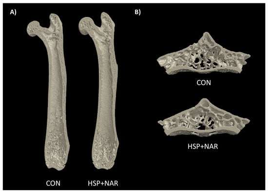 Representative images of the right femur (A) and the second lumbar vertebra (LV2) (B) of 6-month-old female mice whose mothers were exposed to control (CON) or 0.5% hesperidin (HSP) and 0.25% naringin (NAR) diets through pregnancy and lactation. Coronal sections consisting of the ventral half of the femur are depicted in (A); Transverse sections consisting of 1.011 mm of the vertebral body midsection are depicted in (B).