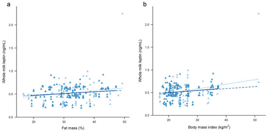 Higher %FM and BMI were associated with higher concentrations of both whole (Figure 1a,b) and skim milk (Figure 2a,b) leptin (Table 4). Accounting for the month of lactation as a main linear effect or as a factor did not change the associations with %FM and BMI for both whole and skim milk leptin. Significant negative interactions were seen between %FM and the month of lactation for whole milk leptin, (2 m: reference; 5 m: −0.02 ± 0.01, p = 0.023; 9 m: −0.02 ± 0.01, p = 0.003; 12 m: −0.03 ± 0.01, p < 0.001; month of lactation as a factor: p = 0.008), and for skim milk leptin (2 m: reference; 5 m: −0.02 ± 0.01, p < 0.001; 9 m: −0.02 ± 0.01, p < 0.001; 12 m: −0.02 ± 0.01, p = 0.002; month of lactation as a factor: p < 0.001); and also between BMI and the month of lactation for whole milk leptin, (2 m: reference; 5 m: −0.02 ± 0.01, p = 0.026; 9 m: −0.03 ± 0.01, p < 0.001; 12 m: −0.03 ± 0.01, p < 0.001; month of lactation as a factor: p < 0.001), and for skim milk leptin (2 m: reference; 5 m: −0.02 ± 0.01, p < 0.001; 9 m: −0.02 ± 0.01, p < 0.001; 12 m: −0.01 ± 0.01, p = 0.005; month of lactation as a factor: p = 0.001), indicating that the association between adiposity and leptin weakens over the first 12 months of lactation.