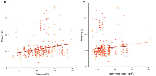 Associations between protein concentration and (a) maternal percentage fat mass; and (b) maternal BMI. Combined subset data points are shown as cross-sectional (pale orange) and longitudinal (dark orange). Lines are fixed effects from univariate linear mixed effect models: pale orange dotted line—combined cohort (Table 5); solid dark red line—longitudinal cohort (Table S1).