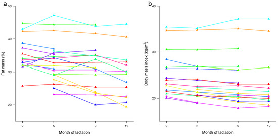 Longitudinal changes in (a) maternal percentage fat mass and (b) maternal BMI from 2 to 12 months of lactation. Lines are colour-coordinated for the individual participants (e.g., dark orange in panel (a) is a same dark orange in panel (b)) for illustrative purposes only (n = 21).