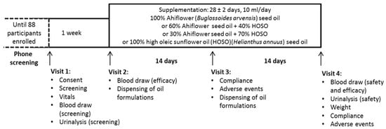 Approximately 7–10 days following Visit 1, enrolled subjects were randomly allocated to one of four supplementation groups (100% HOSO (HOSO group), 100% Ahiflower (100% group), 60% Ahiflower + 40% HOSO (60% group) and 30% Ahiflower + 70% HOSO (30% group)) at Visit 2 by the study coordinator. A block randomization method using an online algorithm (random.org) with two blocks of 20 and two blocks of 24 subjects generated a participant enrollment order. The study coordinator and the study nurse were aware of which groups were assigned 100% oils and which groups were assigned oil blends, but not the composition of each individual formulation. This was necessary to identify which participant underwent the whole blood inflammation response analysis. The study physician was blinded until all safety and efficacy data were compiled and pre-determined statistical analyses completed. The identity of the oil formulations was kept at the bottling facility. The four groups consumed 10 ml/day of one of four oil formulations (100% HOSO, 100% Ahiflower, 60% Ahiflower or 30% Ahiflower). Subjects were provided one bottle of oil at Visit 2 for days 1–14 and a second bottle at Visit 3 for days 15–28. Subjects were instructed to store the bottles of oil in the refrigerator and to measure (using a single-use oral syringe) and consume 10 mL of oil daily, preferably at the same time of day, with a meal, for 28 ± 2 days. They were given the option to consume the oil directly from the syringe or to add to a food compatible with oils such as yogurt, pasta sauce or a piece of bread. Visit 2 included a blood draw (following a 10 to 12 h fast) for baseline fatty acid analyses. Participants assigned pure oils provided an additional 2 mL of blood for inflammatory response analyses at Visits 2 and 4. At Visit 3, reported adverse events (AE) were documented. Visit 4 included a blood draw (following a 10 to 12 h fast) and a urine test for measurement of safety and efficacy endpoints as well as recording of AE. Safety endpoint materials (blood and urine samples) were promptly forwarded to the Centre Hospitalier Universitaire Dr-Georges-L.-Dumont clinical laboratory in Moncton, NB, for processing and analyses.