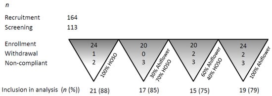 The single withdrawal from 100% HOSO group was due to a serious AE (unlikely related to consumption of a dietary oil). One participant from 100% Ahiflower group withdrew consent and a second participant withdrew consent due to an AE (acid reflux and nausea). All participants in the 30% Ahiflower group completed the study. One participant from 60% Ahiflower group withdrew consent prior to starting supplementation and a second participant was lost to follow-up. Two participants from the 100% HOSO group (12%) and three from each of the other groups (15%–25% of participants) were excluded from efficacy analyses due to lack of compliance to the dosage protocol.