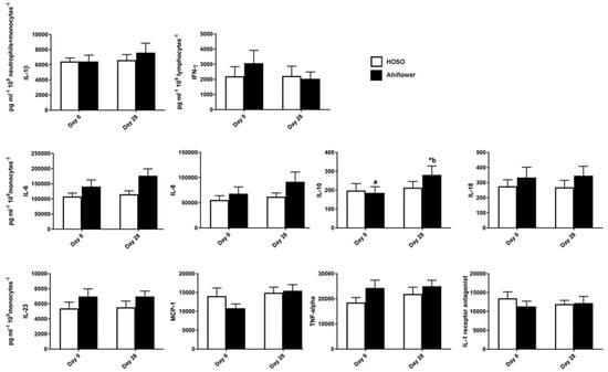 LPS-stimulated cytokine and chemokine production in whole blood. Whole blood was incubated with LPS (10 ng/mL) for 24 h prior to supplementation and after 28 days of dietary supplementation with the indicated oils. Cytokine and chemokine concentrations were measured in the supernatant using the Human Inflammation Panel (LEGENDplexTM, BioLegend, San Diego, CA, USA) and were normalized to their main cell producer. HOSO group n = 21, Ahiflower group n = 19. Data are mean ± SEM. * Different from baseline, p < 0.05; conditions with different letters were different at Day 28 as determined by LMM, p < 0.05. IL-1β = interleukin-1beta; IFN-γ = interferon-gamma; IL-6 = interleukin-6; IL-8 = interleukin-8; IL-10 = interleukin-10; IL-18 = interleukin-18; MCP-1 = monocyte chemoattractant protein-1; IL-23 = interleukin-23; TNF-α = tumor necrosis factor-alpha; IL-1 = interleukin-1.