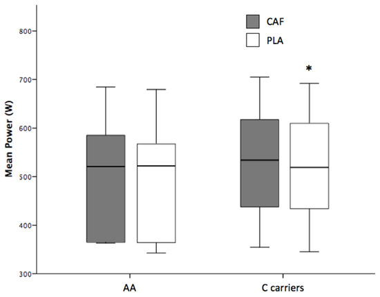 Mean power during the Wingate test with the ingestion of caffeine or a placebo in AA homozygotes (n = 5) and C-allele carriers (n = 16). (*) Different from placebo condition (p < 0.05).