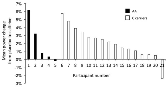 Previous investigations have been aimed at determining the influence of the −163C>A SNP on the ergogenic effects of caffeine, although the outcomes of this research are inconsistent [27,28,29]. It has been found that C-allele carriers for this SNP (CC homozygotes and CA heterozygotes) experienced a greater improvement with caffeine (6 mg·kg−1) than AA homozygotes during a 3 km cycling trial, which is in agreement with the mechanism that relates AA homozygosity with a higher caffeine metabolism/clearance [28]. However, AA homozygotes had greater ergogenicity compared to C-allele carriers after ingesting caffeine (6 mg·kg−1) prior to a 40 km time trial [27]. It has even been found that the ergogenic effects of caffeine (~4 mg·kg−1) are unmodified by the −163C>A SNP because the change in performance induced by caffeine was similar for AA homozygotes and C-allele carriers during a 15 min cycling test [29]. In light of the contradictory outcomes surrounding this topic, the aim of the present study is to provide additional information about the influence of genetic variations of the CYP1A2 gene on the physical and cognitive ergogenicity derived from caffeine ingestion. We hypothesized that AA homozygotes for the CYP1A2 −163C>A SNP would not obtain lessened ergogenic effects after caffeine ingestion when compared to the C-allele counterparts, indicating that the CYP1A2 genetic variations are responsible, in part, for the existence of caffeine non-responders.