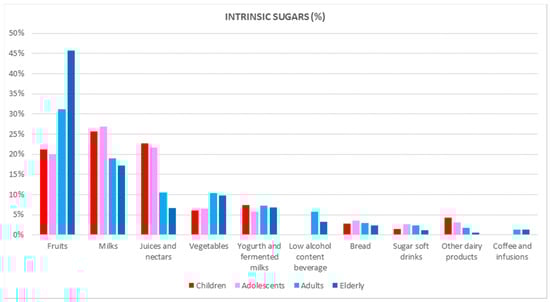 Interestingly, summing up the usually perceived healthy foods (fruits, milks, juices/nectars, vegetables, and yogurt and fermented milk) accounted for 80% of the total intrinsic sugars, which was higher in women versus men. For the youngest groups (9 to 17 years), milks ranked first, whereas in adults and the elderly, fruits were the main contributor of intrinsic sugars. Concerning the micronutrient dilution (e.g., vitamins) phenomenon that may occur when the diet model is more based on energy-dense and nutrient-poor foods and beverages, it was found that the sum of the fruits and vegetables contribution (55.4%) to the total intrinsic sugars in the elderly was remarkably higher when compared to the children (27.3%) or adolescents (26.6%).