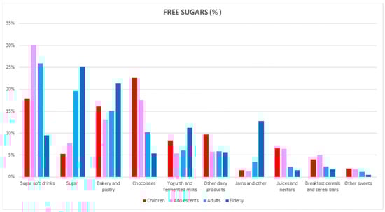 The major dietary sources for free sugars (Table 6) in the ANIBES Spanish population were sugar soft drinks (25.5%), sugar (17.8%), bakery and pastry items (15.2%), chocolates (11.4%), yogurt and fermented milk (6.44%), other dairy products (5.99%), jams (3.58%), juices and nectars (2.91%) and breakfast cereals and cereal bars (2.78%), accounting for >90% of the contribution.