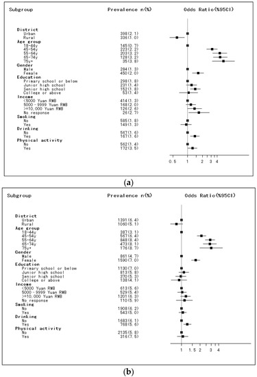 Association between socio-demographic factors or lifestyle and hypercholesterolemia in both surveys *; *: Models were adjusted for the variables in the figure. (a) Survey 2002; (b) Survey 2010–2012.