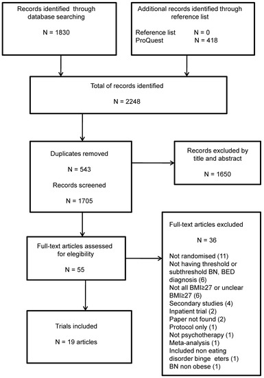 The literature search identified 2248 articles, of which 543 were duplicate papers. From 1705 papers, 1650 were excluded after title and/or abstract inspection, and 36 excluded after full article inspection. Nineteen articles were included in this review. Thirteen published articles provided full information for data extraction [17,27,28,29,30,31,32,33,34,35,36,37,38], and six further trials were included but had incomplete information, i.e. inclusion under 10% of participants with BMI ≤ 27 kg/m2 and/or the EDs’ diagnosis was not determined by a validated instrument [39,40,41,42,43,44]. Just one secondary study was included due to assessment of a long-term intervention (up to six-year follow-up) [35]. These results are illustrated in Figure 1. The most common reason for excluding full text articles was not being randomized (n = 11), followed by participants not having a diagnosis of BN, BED or subthreshold forms of these disorders (n = 6). A table with the excluded articles followed by the references list is added as Supplementary Material Table S1.
