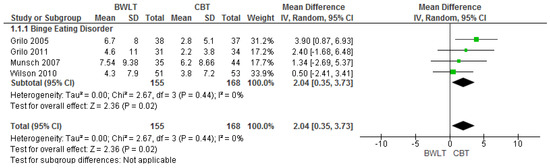 Four trials compared BWLT versus CBT [17,29,30,34] (note Munsch, 2012 was a secondary study and thus not included in this meta-analyses [35]). When aggregated in meta-analysis, a greater reduction in binge eating frequency was found with CBT when compared to BWLT at end of treatment (n = 4 trials, 323 participants; MD 2.04 95% CI, 0.35 to 3.73) (Figure 2).