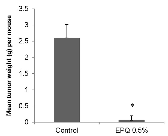 Effect of 0.5% EPQ dietary supplementation on mean weight of A-2780 ovarian tumors in female nude mice injected with 2 × 106 A-2780 cells (* indicates significance of p < 0.0001 with respect to control).