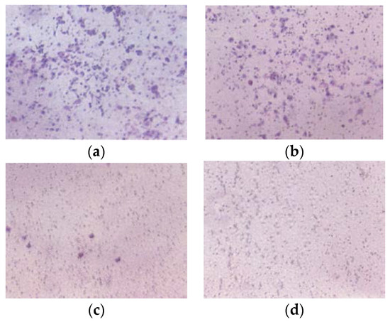 Effect of EPQ on Matrigel invasion of A-2780 cells: photomicrographs (a) Control, (b) EPQ 50 μg/mL, (c) EPQ 100 μg/mL, (d) EPQ 250 μg/mL.