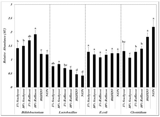 The cecum-to-bodyweight ratios were significantly (p < 0.05) higher in the prebiotic treatment groups compared to the controls. The ceca of subjects that received stachyose and raffinose increased, indicating an increase in their content of bacterial populations (Table 1).
