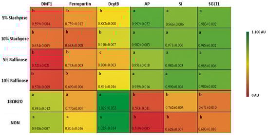 The relative expressions of DcytB, DMT1, and ferroportin were all significantly (p < 0.05) down-regulated in the presence of both concentrations of stachyose and raffinose (Figure 2). The down-regulation of these genes is in turn suggested to be an indicator of Fe-replete conditions. This is a potential biomarker for improved Fe status.