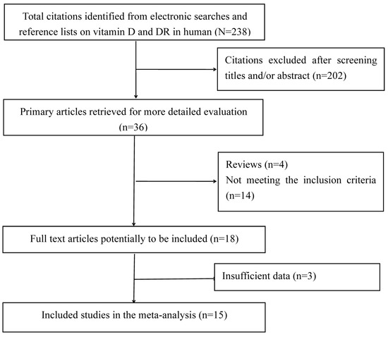 Relevant articles were identified by a systematic literature search of Pubmed, Medline, and EMBASE through September 2016, using the following keywords: “vitamin D” or “cholecalciferol” or “25-hydroxyvitamin D” or “25(OH)D” in combination with “diabetic retinopathy” or “retinopathy” or “DR”. Additionally, we manually searched all eligible original articles, reviews, and other relevant articles. This meta-analysis was performed following the guidelines for observation study protocols (Meta-analysis Of Observational Studies in Epidemiology (MOOSE) guidelines) [17].