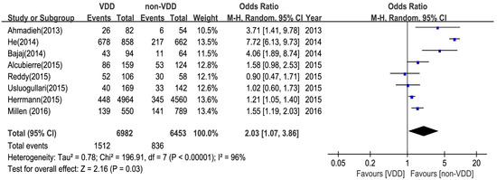 The relationship between serum vitamin D deficiency (VDD) and the risk of diabetic retinopathy is shown in Figure 2 and Supplementary Table S2. Eight studies involving 13,435 participants were included. As the results of this meta-analysis show, type 2 diabetes with vitamin D deficiency (serum 25(OH)D levels <20 ng/mL) had an increased risk of developing diabetic retinopathy (OR = 2.03, 95% CI: 1.07, 3.86) in the random-effects model.