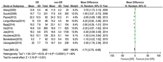 The comparison of the mean difference between the DR group and the control group (non-DR group) is shown in Figure 3. From the results of the random-effects model, the pooled effect was −1.7 ng/mL (95% CI: −2.75, −0.66) and significant heterogeneity was observed (I2 = 80%, p < 0.001). It showed that serum 25(OH)D levels were significantly lower in diabetic retinopathy patients than the control in type 2 diabetes. This result demonstrated that vitamin D deficiency is significantly related with an increased risk of DR.