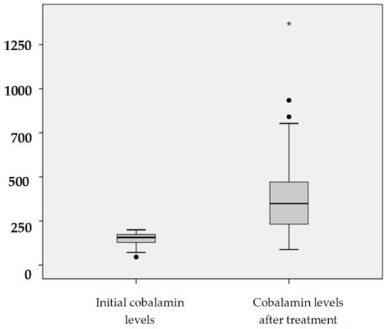 Serum cobalamin levels (pg/mL) before and after treatment with oral cyanocobalamin. * Extreme value (1369 pg/mL).