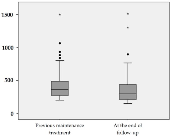 Eighty-two patients with CD and previous documented B12 deficiency were treated with oral B12 to maintain their correct cobalamin levels. Seventy-eight percent of them (64/82) had been previously treated with oral B12 to correct the deficiency and 22% (18/82) with intramuscular B12 treatment. The mean serum cobalamin concentration before oral maintenance treatment was 429.39 ± 222.65 pg/mL (median 368, interquartile range of 273–489 pg/mL). After a mean follow-up of 1091 ± 841 days (median 892, interquartile range 375–1765), the oral B12 route was effective to keep serum cobalamin levels >200 pg/mL in 81.7% (67) of patients. The mean serum cobalamin concentration after follow-up was 364.45 ± 226.62 pg/mL (median 298.5, interquartile range of 214–440 pg/mL). See Figure 2 and Table 5. Interestingly, a lack of oral B12 treatment adherence was admitted by almost half (46.6%, 7/15) of the patients who failed to keep normal levels of cobalamin with the oral maintenance treatment.