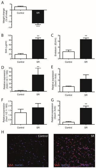 Mice subjected to sleep restriction (SR) for 21 h daily during 15 days lost weight (Figure 1A). After seven and 15 days of SR, mice lost approximately 7% and 12% of weight, respectively. SR led to an increase in serum SAA and endotoxin of approximately four times (Figure 1B,C). Saa1.1/2.1 and Saa3 are inducible tissue-specific isoforms in the liver and adipose tissue, respectively [5,20,21]. Sleep restriction led to the mRNA expression of tissue-specific isoforms of SAA (Figure 1D–G). In the liver, the isoform Saa1.1/2.1 was upregulated 10–40 times (Figure 1D) and Saa3 remained unaltered (Figure 1E). In adipose tissue, whereas no difference in Saa1.1/2.1 expression was observed (Figure 1F), the isoform Saa3 was upregulated around seven times (Figure 1G). The data was confirmed by immunostaining the adipose tissue, where SAA production was induced after SR (Figure 1H).
