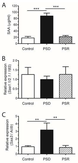 Although it was not possible to identify which specific SAA isoform was increased in the mice serum, it is expected to be the hepatic-induced isoforms Saa1.1/2.1, once Saa3 does not contribute to circulating SAA levels [5,21,24]. SAA3 is related to adipose tissue inflammation and its expression regulation may involve a direct induction by the hepatic isoforms Saa1.1/2.1 [6,25].