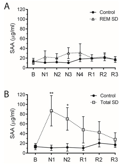 Total sleep deprivation increases plasma SAA in human. Thirty healthy male volunteers aged between 19 to 29 years were randomly assigned to one of three experimental groups after providing a written informed consent (10 in a non-sleep-deprived group (Control), 10 in a total sleep-deprived group (Total SD), and 10 in an REM-sleep-deprived group (REM SD)). Exclusion criteria included the following: sleep disorders, obesity and obstructive sleep apnea (OSA). Plasma SAA concentration in (A) REM SD and (B) Total SD. Data are means ± SEM (* p < 0.05, ** p < 0.01).