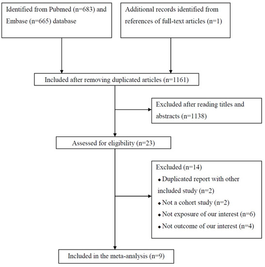 Figure 1 presents a flow diagram of articles included in the present study. In the initial search process, 1348 studies were identified from the Pubmed and the Embase databases. After removing the duplicated articles, 1161 studies were included for further assessment. A total of 1138 studies were excluded after reading the titles and the abstracts. The remaining 23 studies were evaluated to assess for eligibility after reading the full-text. Finally, nine cohort studies were eligible for inclusion in our meta-analysis [27,28,29,30,31,32,33,34,35]. One of the nine articles was identified from references of a full-text article [29].