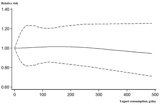 Dose-response association between yogurt consumption (g/day) and the incident risk of cardiovascular disease. Solid line, best-fitting restricted cubic spine; dotted line, 95% confidence interval.