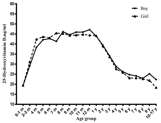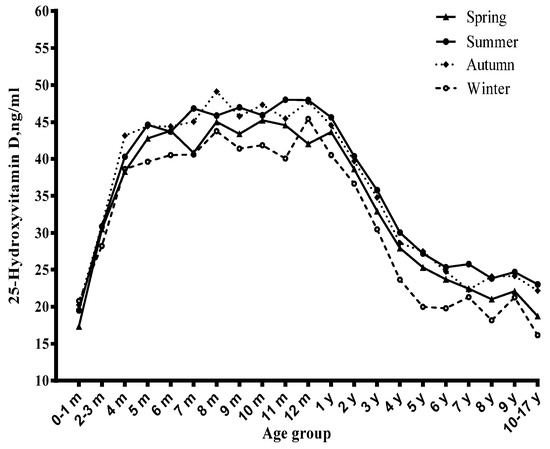 There is growing concern about vitamin D status (serum 25-hydroxyvitamin D (25(OH)D) concentration). Vitamin D deficiency is becoming a public health problem in both developed and developing countries [1,2,3]. It is estimated that more than one billion people have suffered from insufficient vitamin D [4]. Vitamin D deficiency is related to numerous adverse health issues, besides skeletal effects, and various chronic diseases, such as common infections, cancer, autoimmune and cardiovascular diseases, are also related to serum 25(OH)D concentrations. It has been reported that vitamin D deficiency in infancy is suspected to lead to type 1 diabetes in adults [5], and there is a strong association between nutritional rickets and pneumonia [6]. Simultaneously, the prevalence of vitamin D deficiency is associated with metabolic syndromes in children [7]. Therefore, greater attention has been paid to vitamin D status during childhood.
