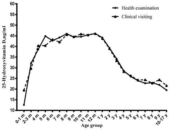 A total of 13,997 children aged one day to 17 years were included in this study, including 7739 boys and 6258 girls. Of them, 8499 went to the hospital for a health examination, while 5498 for were there for a clinical visit. Overall, 23.28% children suffered from low vitamin D status (<30 ng/mL), while 6.43% had vitamin D deficiency (<20 ng/mL). When children were greater than one year old, the prevalence of vitamin D insufficiency and deficiency increased sharply with age.