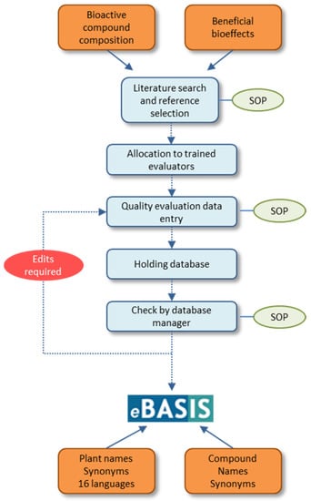 eBASIS [28], hosted by EuroFIR AISBL [29], with access via membership packages or within EU projects, is a relational database served by Microsoft Windows Server version 2008 R2 Enterprise, Microsoft Internet Information Services version 6.1, and Microsoft SQL Server version 2008. (Microsoft, Redmond, WA, USA), which is also verified to operate on version 2012. eBASIS is managed by two institutions, the composition data by the Institute of Food Research, UK and bioeffects data by University College Cork, Ireland. Data entry is carried out by trained evaluators sourced from EU-funded projects and all inputs are checked by database managers before appearing in the database. The data entry goal is to source, extract, and quality-assess data from peer reviewed publications concerned with the composition and biological effects of bioactive compounds in foods. All evaluators are fully trained in the use of the form with regular evaluator assessments to check performance and to ensure uniformity between evaluators. The data input form is designed to promote consistency in data entry with 35 fields used in composition, and 42 in bioeffects, records. The forms are designed to be unambiguous and simple to use and come with clear instructions for use. Where possible, pick lists are used, which also enable detailed searches to be carried out by database users; free text fields are intentionally limited to simplify reporting and data analysis of eBASIS contents. All inputs are submitted to a holding database for inspection by a database manager who inspects all fields in the form, checking for inconsistencies or errors before accepting into eBASIS. Publications are sourced and assessed through standardised search and selection protocols, and each food-compound combination is entered separately. Standard operating procedures (SOPs) are followed in each step of the compilation process. The compilation procedure with critical steps, SOPs and database composition is summarised in Figure 1.
