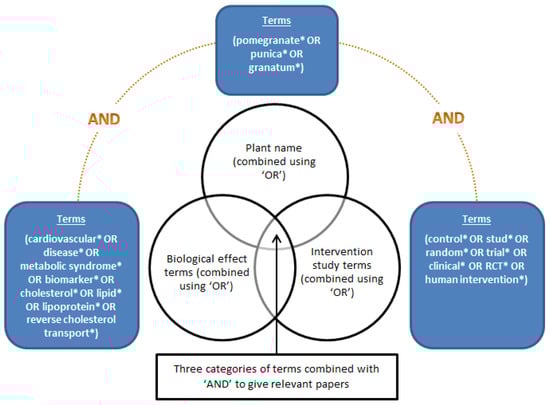 The bioeffects searches were designed using three groups of search terms: prioritised biological effect search terms, e.g., cardiovascular disease, hypertension, oxidative stress, metabolic syndrome; plant name (Latin name and common name); human intervention study terms, e.g., control*, stud*, random*, trial*, clinical*, RCT, human intervention*. The literature reviews carried out on beneficial data remain largely the same as that used in the development of the ePlantLIBRA database, a compositional and biological activity database for bioactive compounds in plant food supplements [33]. An example of search design for beneficial bioeffects in pomegranate is shown in Figure 2. After searching for suitable peer-reviewed publications, the resulting literature was reviewed and some papers were excluded, examples for reasons for exclusion are as follows; Data on compounds not prioritised in eBASIS database; Non-edible plant parts; development of analytical methods for identification only, no analytical data; unacceptable analytical procedures; review articles; no control included in trial (non-RCT); unacceptable experimental procedures; insufficient documentation for evaluation.