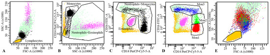 Gating strategy to identify the three peripheral blood monocyte subsets (Mon1, Mon2 and Mon3). (A) FSC/SSC-dotplot was set to identify leukocytes and select lymphocytes; (B) Leukocytes were plotted in a SSC/CD14-dotplot to select high-SSC cells as Neutrophils+Eosinophils and intermedia-SSC and CD14++/+/− as Monocytes; (C) Leukocytes were also plotted in a CD14/CD16-dotplot to select Eosinophils (auto-florescent cells) and Monocyte+Neutrophils, clearly separated from the rest of the blood cell subsets. Logical combination of these gates allowed discrimination between Lymphocytes, Monocytes, Neutrophils and Esosinophils; (D) To identify the three monocyte subsets, a CD14/CD16 dotplot was used: Mon1 (CD14++CD16−, red), Mon2 (CD14++CD16+, green) and Mon3 (CD14+CD16++, blue); (E) Zoom area of mononuclear cells showing the three monocytes subsets clearly differentiated from lymphocytes and neutrophils.