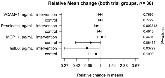 Mean change relative to baseline time in soluble plasmatic marker levels in the interventional and control groups. The values were compared after participants had ingested 80 g/day of dry-cured ham or 100 g/day of cooked ham (n = 38) for 4 weeks (+95% confidence interval).