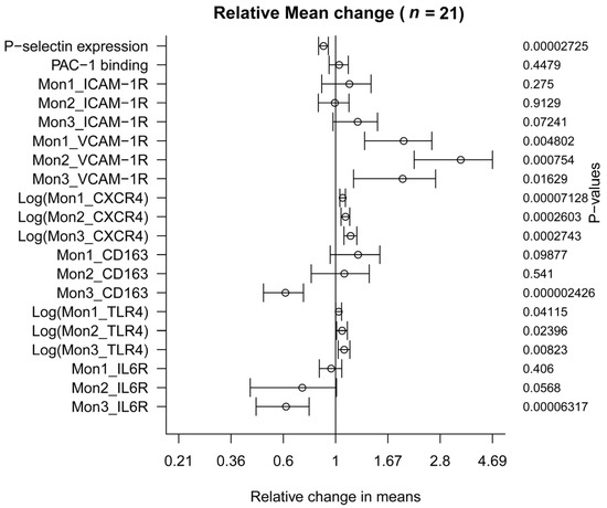 Mean change relative to baseline time in platelet and monocyte activation markers. The values were compared after participants had ingested 80 g/day of dry-cured ham (n = 21) for 4 weeks (+95% confidence interval).