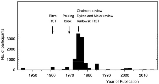 The activity of Pauling, in turn, led to a great upsurge in interest in vitamin C among lay people and also in academic circles in the early 1970s. From 1972 to 1979, in that eight-year period, 29 placebo-controlled studies were published, which amounted to a total of 8409 participants (Figure 1) [68,69]. Thus, the mean number of participants per study was 290.