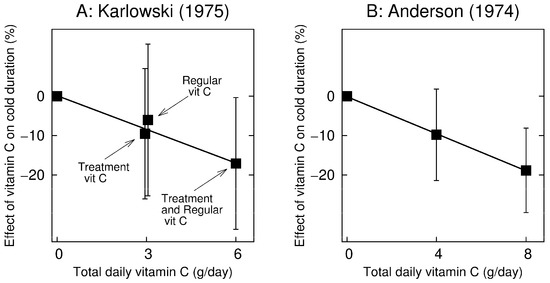 Coulehan (1974) [81] administered 1 g/day to children and observed a 12% reduction in common cold duration, and in parallel they administered 2 g/day to other children and observed a 29% reduction in cold duration. Although the point estimates suggest a dose–response, the study was small and the 95% CIs overlap widely [68,83].