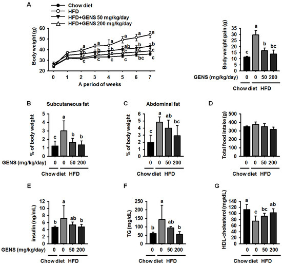 Effect of GENS on body weight change (A); subcutaneous fat (B); abdominal fat (C); total food intake (D); serum levels of insulin (E); levels of serum triglycerides (TG) (F); and high-density lipoprotein (HDL)-cholesterol concentration (G) in high-fat diet (HFD)-fed mice. Five-week-old mice were maintained with or without GENS (50 and 200 mg/kg/day) under HFD for 7 weeks. Data are mean ± SD (n = 6).