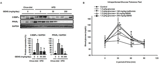 Our previous study, as well as recent studies, suggested that GENS may exert a protective effect on adipogenesis in adipocytes in vitro [49] and in adipose tissue mass in vivo by regulating C/EBPα and PPARγ proteins [19]. Consistent with previous results, our results showed that GENS decreased the expression of C/EBPα and PPARγ in white adipose tissue in HFD-fed mice.