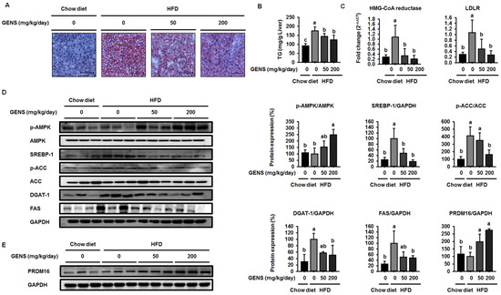 However, these studies did not provide molecular mechanisms for how GENS regulates these processes. In this study, we demonstrated that GENS suppressed hepatic lipogenesis through modulation of the AMPK-SREBP-1 pathway in HFD-fed mice. In regulating energy metabolism, AMPK stimulates the interaction between PGC1α and PRDM16 resulting in increased mitochondrial biogenesis, thermogenesis, and energy expenditure [52]. Interestingly, we noticed that in HFD-fed mice treated with GENS, PRDM16 in the liver was significantly increased, indicating that GENS may elevate mitochondrial biogenesis or thermogenesis via activation of the thermogenic factor PRDM16 in these animals.