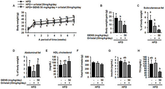 Synergistic effect of GENS and orlistat on weight change (A); body weight gain (B); subcutaneous fat (C); abdominal fat (D); HDL-cholesterol concentration (E); total food intake (F); serum levels of insulin (G); and serum levels of TG (H) in HFD-fed mice. Five-week-old mice were maintained with or without GENS (50 and 200 mg/kg/day) under HFD for 7 weeks. Data are mean ± SD (n = 6).