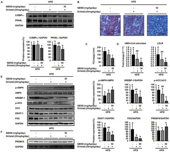 Combination effect of GENS and orlistat on white adipose tissue and hepatic lipogenesis and cholesterol synthesis-associated genes in HFD-fed mice. Five-week-old mice were maintained with or without orlistat (20 mg/kg/day) and GENS (50 mg/kg/day) under HFD for 7 weeks. Each parameter was measured by western blot analysis with C/EBPα and PPARγ (A); The liver sections stained with Oil red O (B); Hepatic TG content (C); Expression levels of HMG-CoA reductase and LDLR genes were determined by quantitative RT-PCR in liver samples (D); p-AMPK, AMPK, SREBP-1, p-ACC, ACC, DGAT-1, FAS (E) and PRDM16 (F). The protein expression level was normalized against AMPK, ACC, and GAPDH. Protein level was quantified using Image J software. Data are mean ± SD (n = 6).